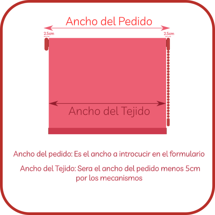 El ancho que debes introducir en el recuadro de medidas al hacer tu pedido será el ancho total del estor, de exterior a exterior de soporte, pero tienes que tener en cuenta que la medida del ancho del tejido será 5 cm menos, pues los mecanismos del estor ocupan 2.5 cm a cada lado.