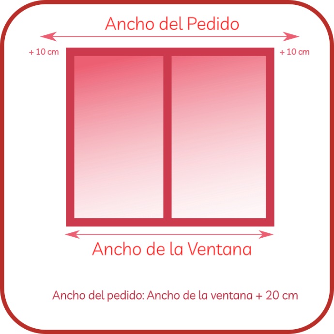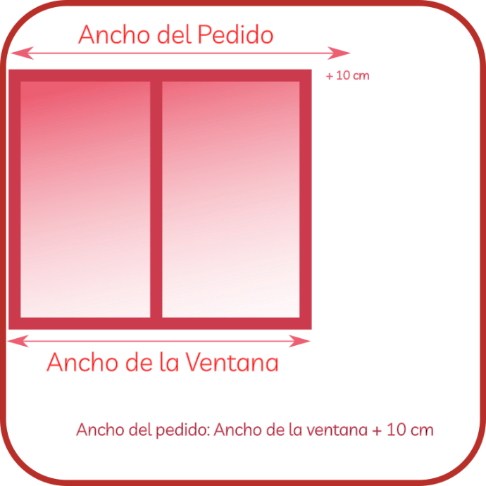 Por ejemplo: Si la distancia desde la pared que encaja la ventana hasta su marco mide 140 cm de ancho, tienes que pedir un estor de 150 cm de ancho (140 + 10 cm).