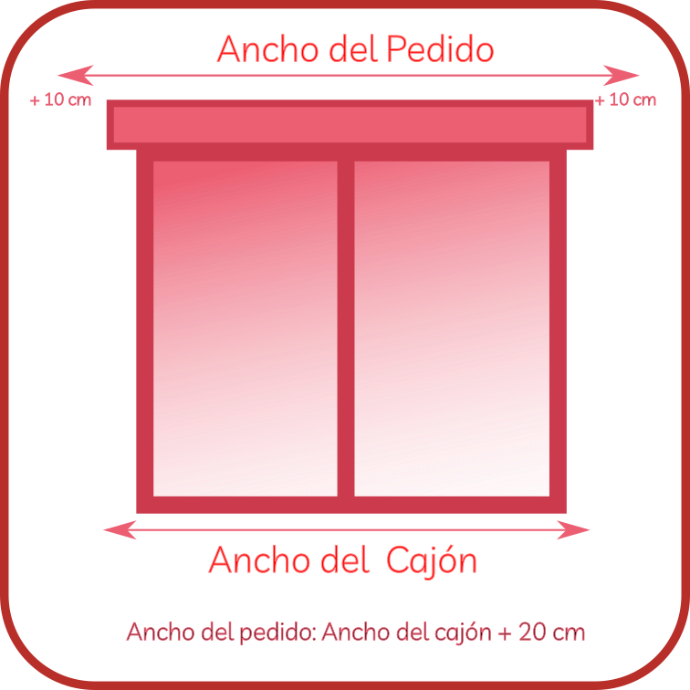 Por ejemplo: en caso de tener espacio a ambos lados: Si el cajón mide 160 cm de ancho, tienes que pedir un estor de 180 cm de ancho (160 + 20 cm).